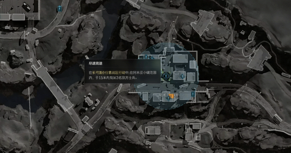 近距离淘汰:在长弓溪谷任意战区行动中,在阿米亚小镇范围内,于15米内淘汰3名敌方士兵(bing)。