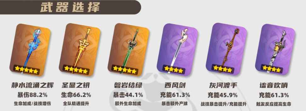 充能武器生命(life)沙、非充武器充能沙;优选净水输出高、绿剑输出也不(nor)差,腐殖紧随其后选;没(mei)有(you)这(zhe)些(xie)选5星、裁叶/雾切/有乐/板砖择一;都没(mei)有(you)就选择灰河渡手、西风剑。