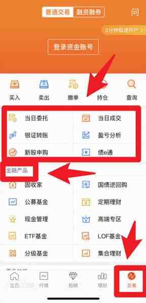 4、在交易页面可查(cha)看(kan)当日委托与成交记录,进(jin)行(xing)银证转账、盈亏分析、新股申购,还(huan)能购买固定收益(shouyi)、基金及其他金融产(chan)品(pin)。