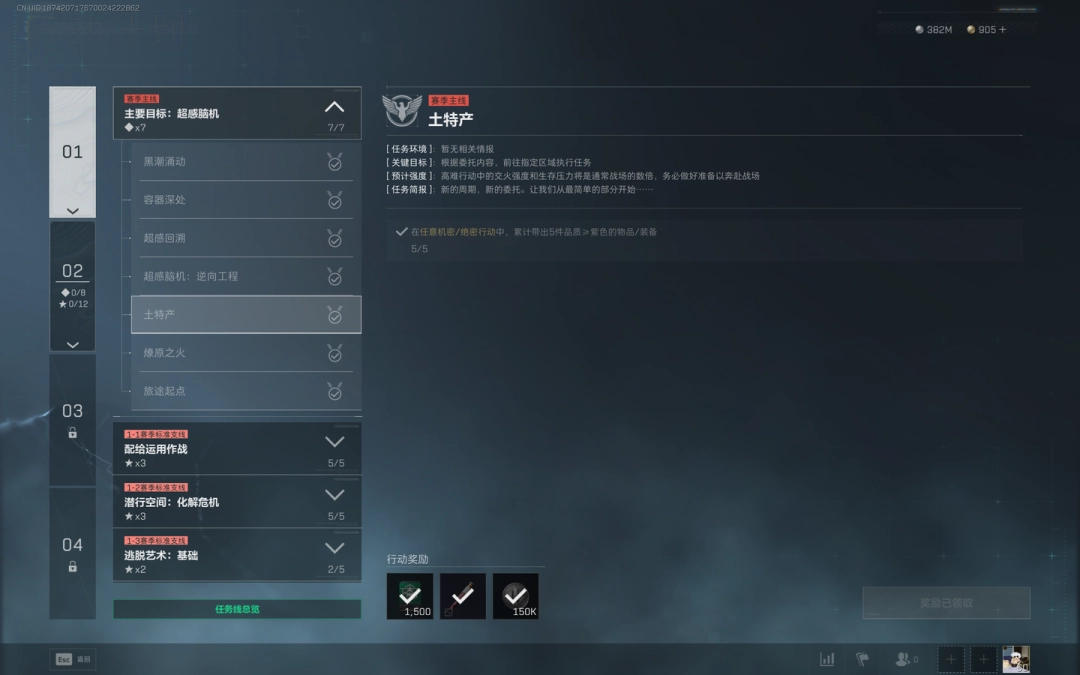 1、任务目(mu)标:在任意(yi)机密/绝密行动中,累计带出5件品质(quality)≥紫色的粅闆/装备。
