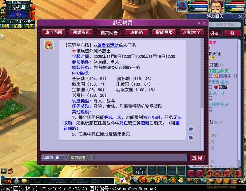 缘分不会凭空而来,总要有人先迈出一步,才会有美好的故事发生。少侠可以在三界中亲身经历,倾听每個人的故事。活动期间全天,玩家(≥30级,单人)在长安城、建邺城、傲来国、朱紫国、宝象国、西梁女国、长寿村的各处探索,可能会遇到陷入苦恼的人们,听他们诉说并解决他们的烦恼可以获得(keyihuode)任务报偿。