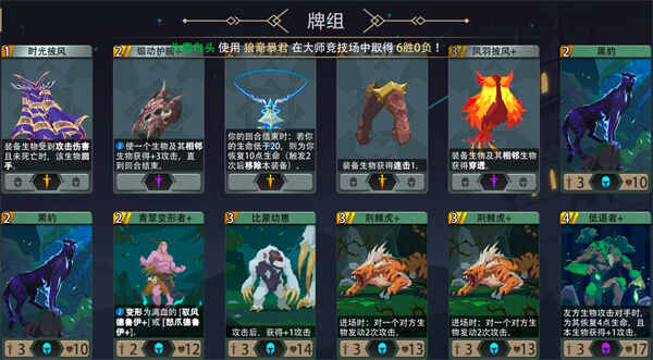 开局删两恐狼,抽两次生物和一次装备,尽量抽一个3费打手开局,实在抽不到就拿山岭巨人或独角兽这(zhe)样的4费打手过渡也行,如果能拿到(dao)好的(haode)生物装备(毁灭之斧 魔蛇手套)可以(yi)直接(direct)开局,前期有余钱就先升荆棘虎方便(bian)解梦魇,金币充足可以(yi)考虑拿一张穿透卡(飞行术&凤羽披风)来应对邪影术士。