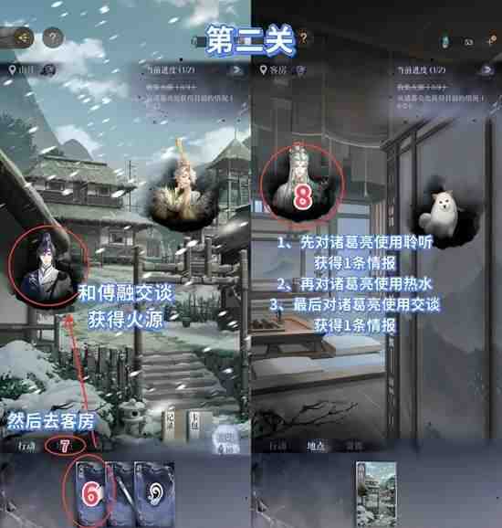 第二关:收集火源,从诸葛亮处获取情报,有三个场景,请按照顺序跟攻略