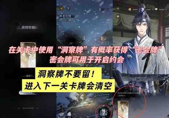 关卡中使用(yong)“洞察牌”有概率(gailv)获取“密会牌”,密会牌可用于开启约会