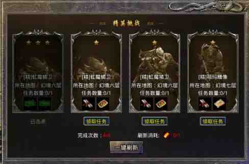 如上图所示,精英(the elite)挑战攻略每次随机刷新四个不(bu)同星级的任务,这里我强烈建议一定要刷俩次三星、俩次俩星任务去做,因(yin)为(wei)只有俩星和三星任务才能(neng)获得以上提到的“玉佩试炼”和“法阵试炼”的门票。