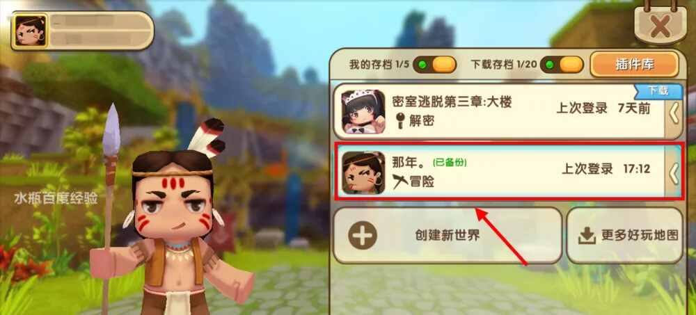 选择一个要备份的迷你世界游戏档,点击该档右侧的箭头图标。
