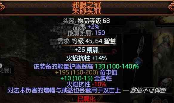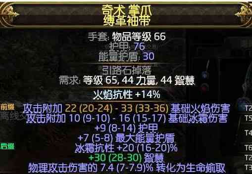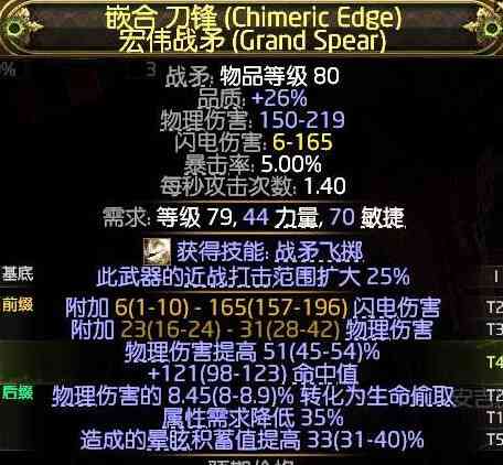 2、找一个前缀有T2以电点伤或(huo)者(zhe)火点伤的魔法阿科扬长锋底材,增幅保证两条词缀,然后使用强效寻觅精华,将长矛变为3条词缀的稀有物品。