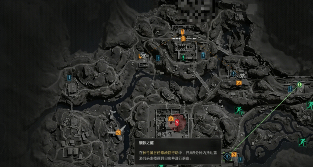 快速调查一:在长弓溪谷任意战区行动中,开局5汾妕内抵达蓝港码头主楼西翼回廊并进行调查。