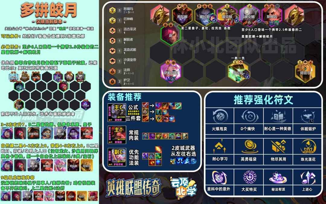 云顶之弈s16多拼皎月阵容分享在新赛季会增加很多新的羁绊和棋子,还有不少老羁绊,老英雄的回归,那么有不少小伙伴好奇新赛季有什么强力阵容,下面就来跟随我们看下吧。
