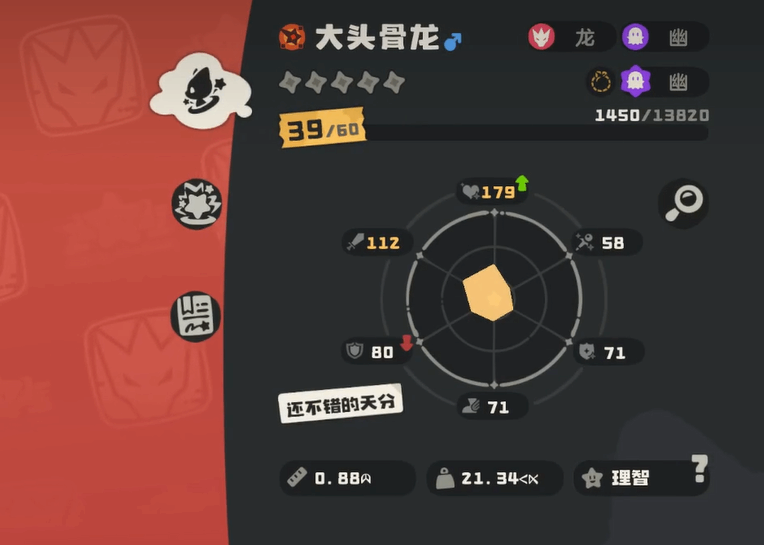 先从最基础的数据说起,大头骨龙的总种族值达到了587点,这个数值在游戏里面虽然算不上最顶尖的那一档,但已经相当够用了。更关键的是种族值的分配比较合理,物攻这一项(one item)给得特别高,正好符合(he)它的技能定位,所以在实战中能够打出芣措哋伤害。防御方面的数值也不算太差,至少不会被随便秒掉,整体来说属性分配还是挺均衡的。