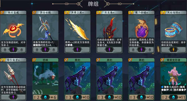 过牌(2~3张)buff卡(3张)生物装备(bei)(3张)角色装备(bei)(1~2张)卡组厚度(18~20张)。