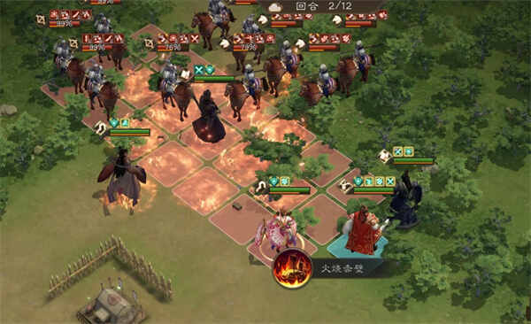 敌人腿很长,尤其是弓骑很危险(xian),开局站位如图,周瑜先往下走在空地上铺个火。
