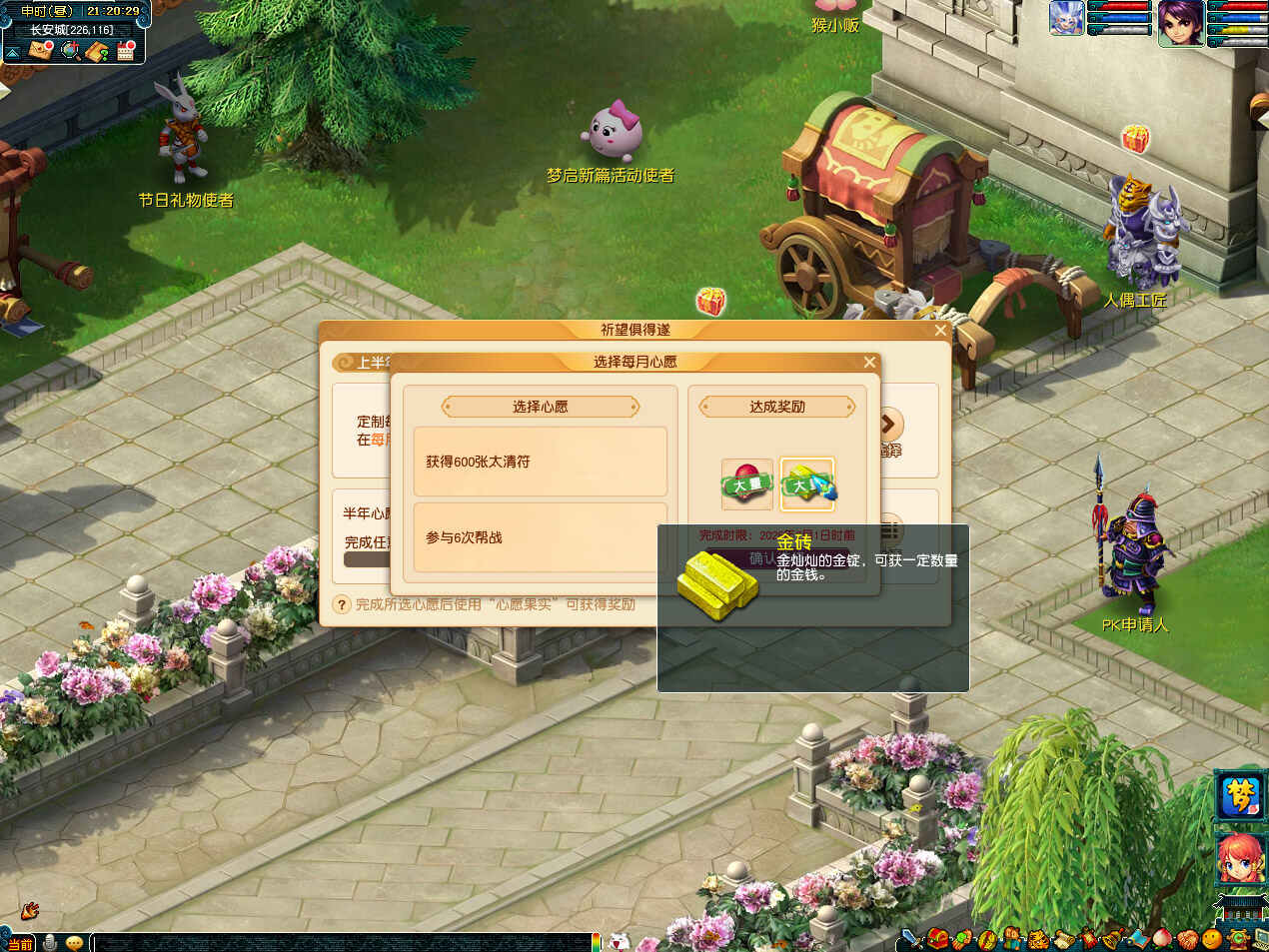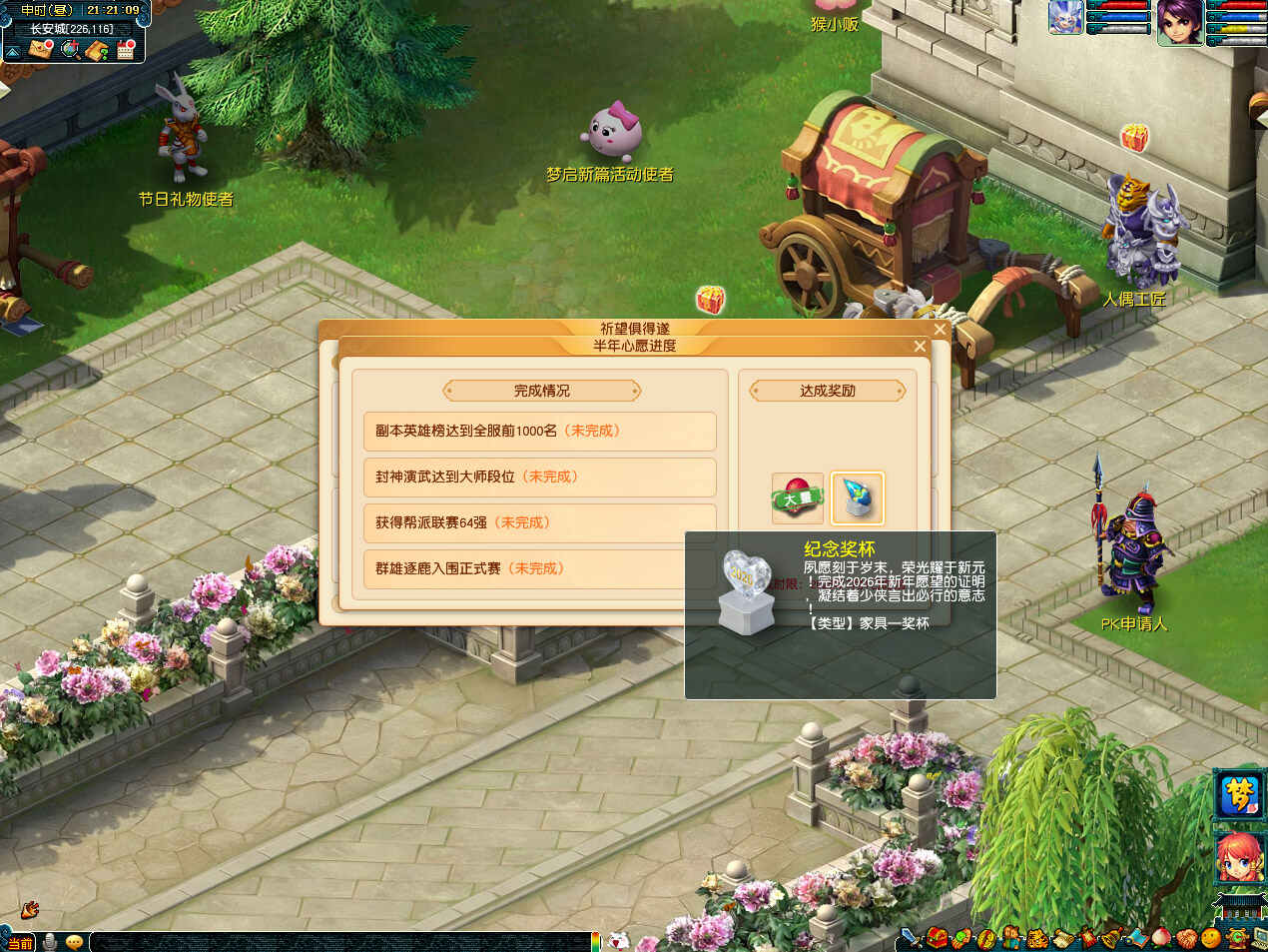 除每月的心愿目(mu)标外,元旦仙子还帮少侠设立了以半年为周期的心愿目(mu)标,完成后将获得丰厚的經験奖励和纪念品家具(jiaju)奖励,少侠可千万不要错过噢!