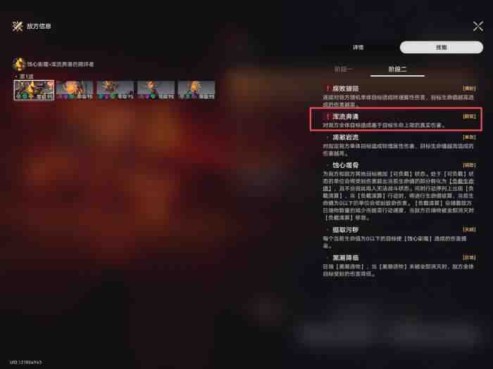 4、一阶段(duan)转二阶段(duan)BOSS新增(Add)一个大招(浑流奔涌),留生存位大招(风堇、灵砂、腾荒、白露等),在BOSS第一次攻击と後,释放大招【浑流奔涌】之前插队治疗避免角色(juese)[负载生命值]超过(guo)10000(成就需要(need)8000以内)