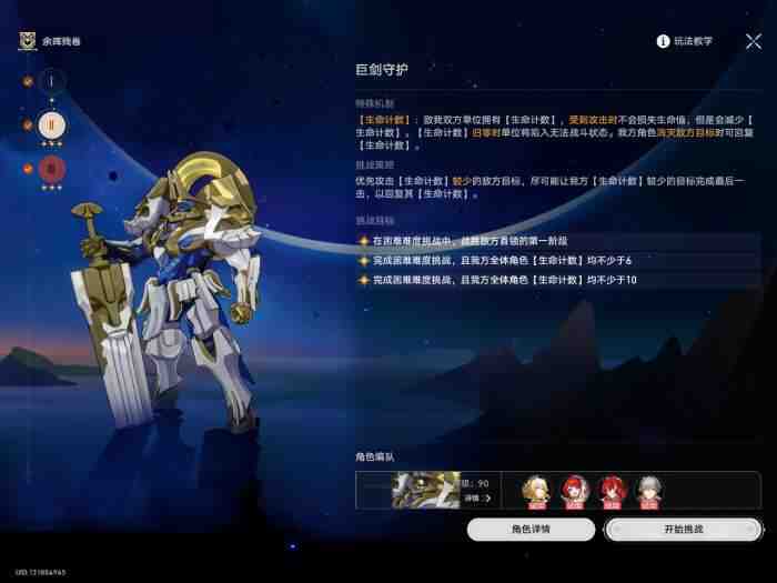 在与「巨剑守护」任意难度的战斗中,我方角色(juese)累计回复12次[生命计数]