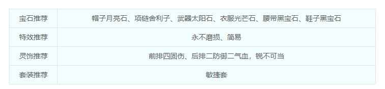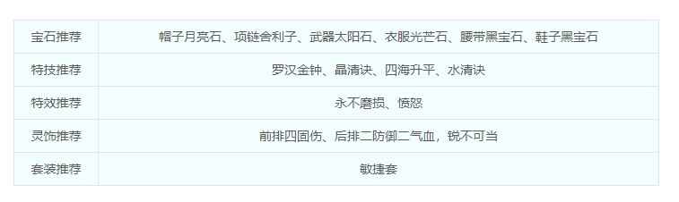 宝(bao)石蓷薦帽子月亮石、项链舍利子、武(wu)器太阳石、衣(yi)服(fu)光芒石、腰带黑宝(bao)石、鞋子黑宝(bao)石特(te)技(ji)蓷薦罗汉金钟、晶清诀、笑里藏刀、流云诀/凝滞术、放下屠刀/光辉之甲/破甲术灵饰蓷薦前排六速度(speed)/四速度(speed)二封印,后排四气血二防(fang)御(yu),血气方刚/健步如飞套装蓷薦变(bian)身(shen)术-修罗傀儡妖