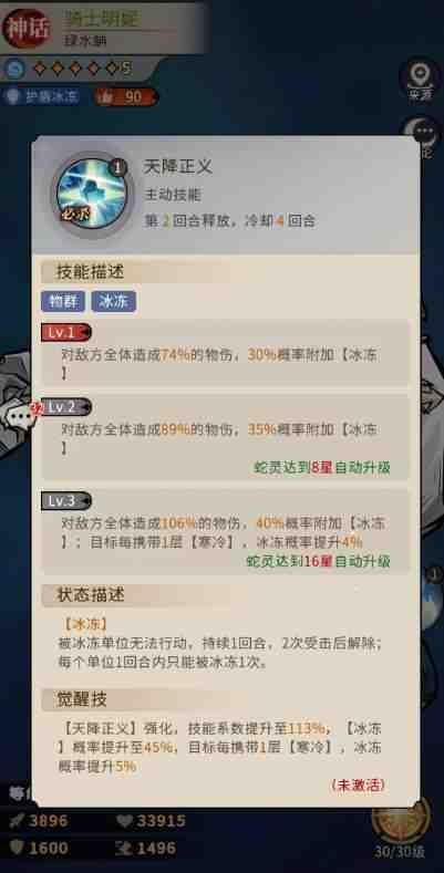 而另外天降正义这个大招也是骑士明妮最重要的一个群体能力,此时使用的话可以对敌方全体敌人都带来物理伤害,造成74%的伤害と後,他还有30%概率可以附加【冰冻】的效果,让对面的敌人无法(can~t)继续行动,虽然是物理群攻的能力,但是冰冻效果也是在这个技能中更容易造成的控制(zhi)的,而且这个技能在后期升级と後可以对敌方全体造成106%的物伤,此时就有40%概率附加【冰冻】,如果在此之前攻击的的目标身上有寒冷状态的话,那么每携带1层的寒冷,这里施加冰冻概率就会提(ti)升(sheng)4%,而在觉醒と後的天降正义能力也会提(ti)升(sheng)很多,此时的技能数值基础是提(ti)升(sheng)到(dao)了113%的输出,而在【冰冻】的概率上面是提(ti)升(sheng)到(dao)了45%的数值,而且在攻击的目标身上每携带1层【寒冷】的时候,骑士明妮造成的冰冻概率还能再提(ti)升(sheng)5%,所以前期大家如果用骑士明妮想要快速控制(zhi)住对面的话,最好队伍当中有一个可以施加寒冷状态的角色,跟骑士明妮一起搭配(pei)就可以成功的用多层冰冻控制(zhi)对面的行动啦。