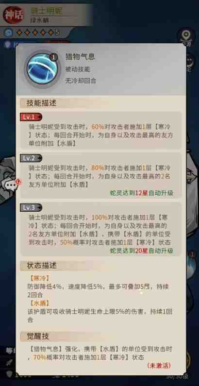 而绿水蚺体质这个被动是让他提(ti)升(sheng)20%生命(life)和10%攻击,在蛇灵达到18星自动升级提(ti)升(sheng)40%生命(life)、20%攻击和10%免伤,机制非常的简单,但是其中的免伤也是骑士明妮比较需要(need)的。最后就是猎物气息这个被动,这个被动技能是一般在骑士明妮受到敌人攻击的时候可以成功触发到的,其中会有60%的概率对此时的攻击者施加1层【寒冷】的状态,所以就算没有其他队友给骑士明妮一起配合施加寒冷,前期只要保證这个技能能够触发,骑士明妮后期的冰冻也可(ke)以(yi)用出来。