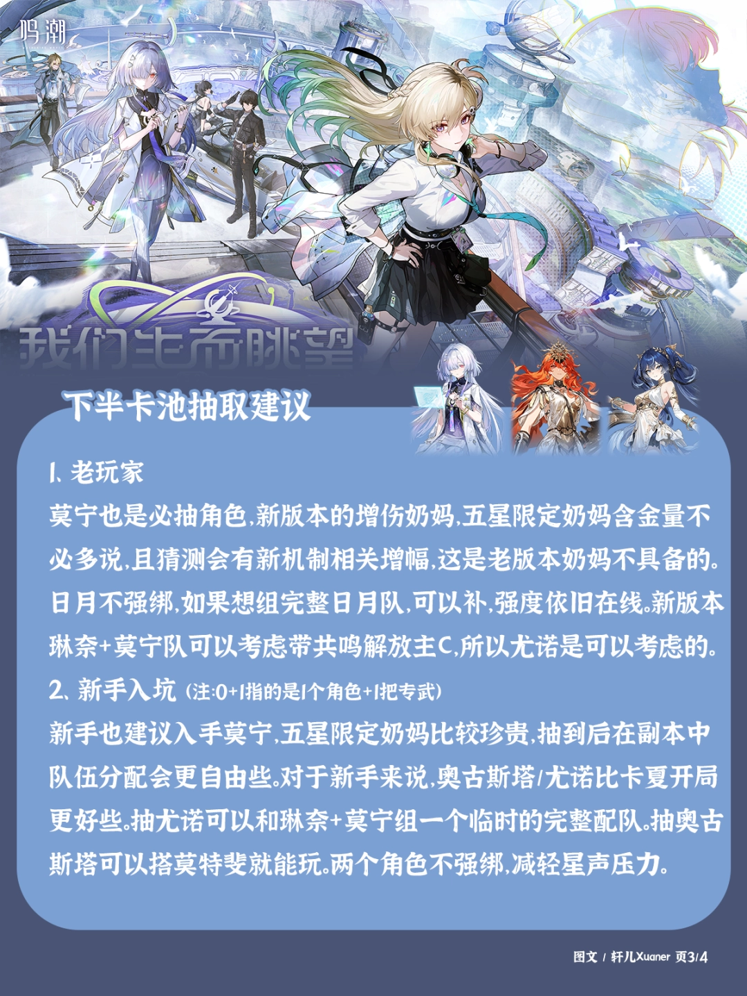 ③ 新漂:建议优先琳奈+莫宁,跑图方(fang)便(bian),新机制。然后根据咱是否氪/肝,欧/非决定抽1个尤诺或奥古斯塔,还是抽卡夏或日月完整配队。