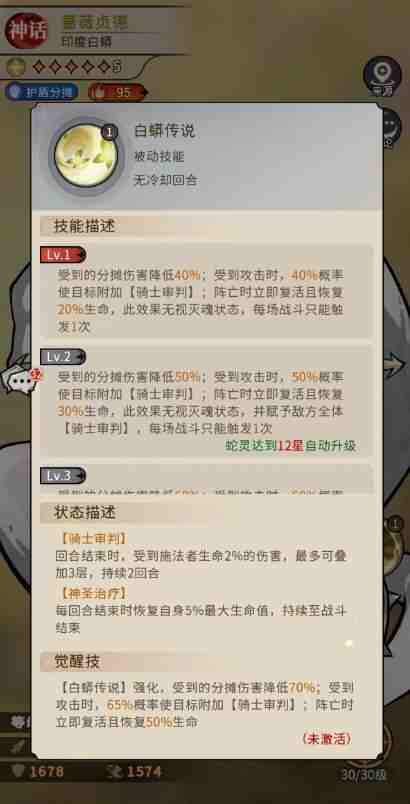 而在这的【神圣治疗】就是让蔷薇贞德每回合结束行动的时候(shihou),可以恢复自身(itself)5%最大生命值,一直持续到这个战斗结束,提升到20星的时候(shihou)她受到的分摊伤害降低60%,受到攻(gong)击(ji)的话会有60%概率使目標附加【骑士(qishi)审判】,而如果是阵亡,此时同时立即复活,但是是恢复40%生命,回复更多,而且觉醒之后的白蟒传说得到的强化还是很高的,在其中受到的分摊伤害会降低70%,而且在她受到攻(gong)击(ji)的时候(shihou),这个时候(shihou)是有65%概率可以使目標附加一层【骑士(qishi)审判】的,如果是阵亡,那么此时复活的话,得到的恢复生命数值是提升到了50%,相当于是还有一半的生存机会。