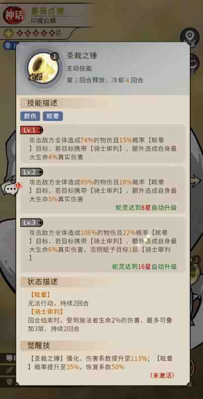 另外一个圣裁之锤技能可以造成的是群伤眩晕,蔷薇贞德会攻(gong)击(ji)敌方全体,对敌人造成74%的物伤且有15%概率可以施加【眩晕】给到供货价的目標,如果在这之前目標身上携带【骑士(qishi)审判】,额外还(huan)可(ke)以(yi)造成蔷薇贞德最大生命4%的真实伤害,而在蔷薇贞德升级到16星的时候(shihou),此时就会攻(gong)击(ji)敌方全体造成106%的物理伤害,且其中有22%概率施加【眩晕】给这个目標,如果目標身上携带【骑士(qishi)审判】,则会额外造成自身(itself)最大生命6%真实伤害,否则会带来1层【骑士(qishi)审判】的效果,在这眩晕的效果会让敌人无法(can~t)行动,而【骑士(qishi)审判】的效果则是在每个蔷薇贞德行动的回合结束时,会受到施法者生命2%的伤害,觉醒之后的【圣裁之锤】在伤害数值上面提升至113%,而【眩晕】产生的概率提升至25%,恢复的数值达到50%。