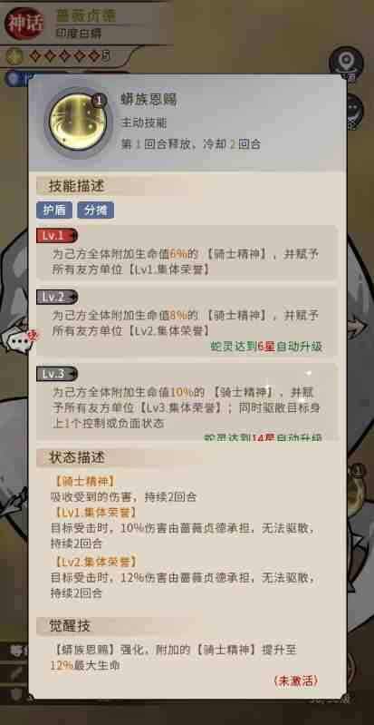 因为蔷薇贞德是印度白蟒的蛇灵,所以在在这被动的增益叫做白蟒体质,可以提升25%生命和15%攻(gong)击(ji),在技能3级的时候(shihou)提升的是45%生命、25%攻(gong)击(ji)和15%免伤。最后的白蟒传说被动技能,是蔷薇贞德受到伤害的时候(shihou),在这可以让分摊伤害降低40%,且同时有40%概率使目標附加【骑士(qishi)审判】,如果是被攻(gong)击(ji)导(dao)致阵亡,那么此时可以立即复活且恢复自己的20%生命,这个效果跟起其他的复活效果一样直接无视灭魂状态,就是每场战斗只能触发1次。