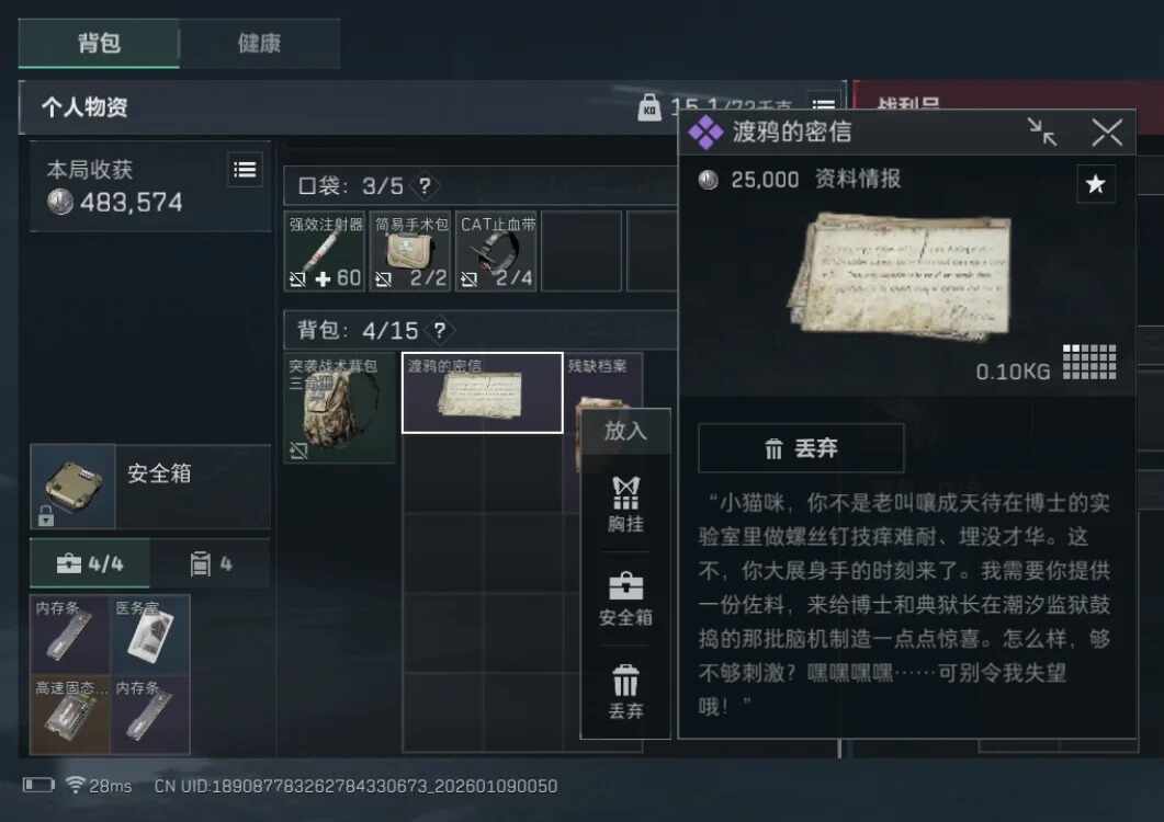 击败渡鸦信使后,其盒子必掉【渡鸦的密信】,价值25000哈夫币!强烈建议(jianyi)湺畱,可能与后续限(xian)定(ding)高(gao)级奖(jiang)励(如“大红”) 相关联。