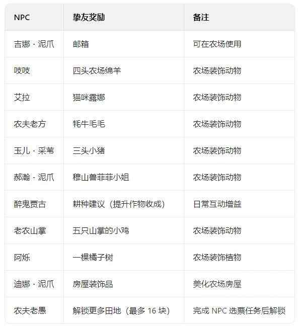 每个NPC达到(dao)挚友后会有特(te)殊报偿如下