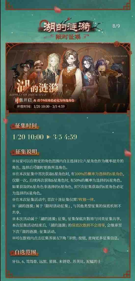 卡池规则(ze):这(zhe)个(ge)卡池是自选up池,可选择范围如图所示,选择之后无法再进行更改。同时这(zhe)个(ge)卡池也是会歪的,歪的范围为所有可自选up6星。卡池持续时间到下版本結娕。