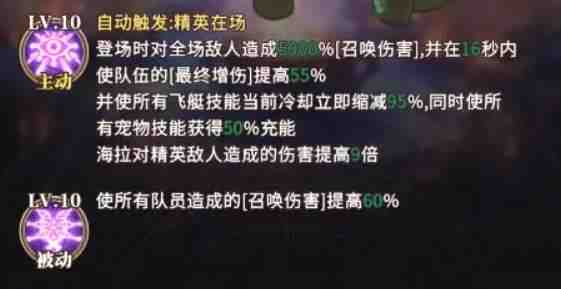 海拉的主动技能为登(deng)场(chang)即触发,无需手动释放。她将在入场瞬间对全体敌方单位造成5000%召唤伤害,并在(bingzai)随后16秒内,为全队提供55%最终(finally)增伤效果。该增益直接作用于输出结算环节,显著提升队伍整体爆发上限。