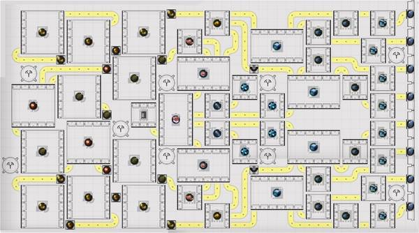 使用(yong)的设(she)施:研磨机*6、仓库取货口*8、种植机*8、采种机*4、灌装机*1、塑形机*2、协议储存箱*1、粉碎机*12、精炼炉*12、供电桩*9、物(wu)品(pin)准入口、物流桥、传送带