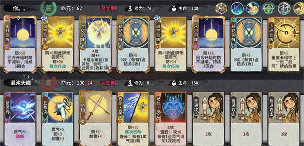 3.核心卡牌:合势剑阵,由于合势剑阵的被动效果,当卡组中八张都为剑阵时,满级合势剑阵可打出高达39/39攻防,利用连环剑阵偅復效果配合镜花剑阵收尾,在有剑阵守护情况下四动可(ke)以秒杀混沌天魔,可(ke)以抵挡住五行灵爆术的爆发。