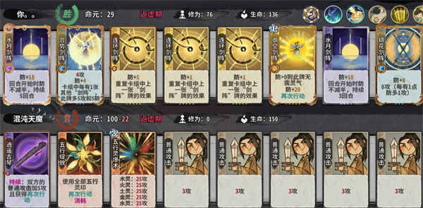 4.过渡:选卡时有合势剑阵直接拿,前期(qianqi)利用灵笔过渡,优先攒出金丹期二级和三级任意卡牌,刷到丹炉后将合势剑阵升到三级化身期优先考虑天资聪颖,可(ke)以在丹炉出现过早的情况下补足合势剑阵等级。