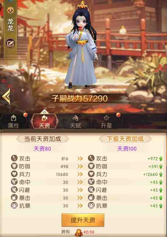 子爵的天资需要消耗天资丹来提升,天资等级越高(gao)所需要消耗的天资但越多,并且天资的提升也会自动增加天赋的加成效果。