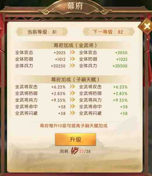 幕府需要消耗天木梁圱级,等级越高(gao)需要的天木梁越多,每升10级即可提升子嗣的天赋,而且每次幕府圱级也可以提升主公全体武将的属性。