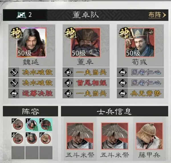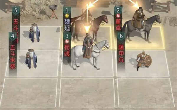 兵种站位:在董卓的下方放置一个藤甲兵,在魏延和荀彧后方各放置一个五斗米祭。