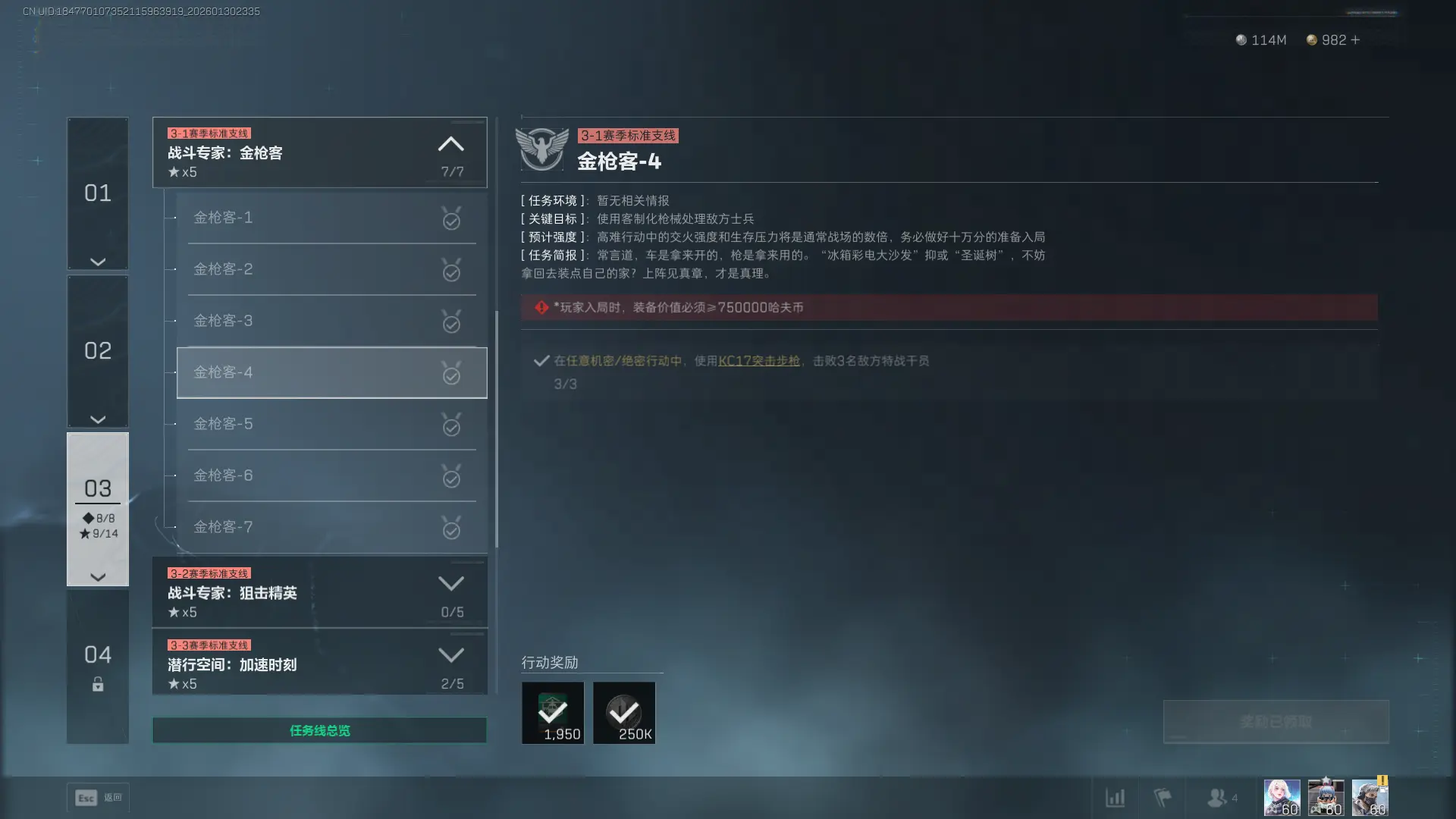 1、任务目标:在姙嬑机密/绝密行动中,采用【KC17突击步枪】,击(ji)败3名敌方特战干员。