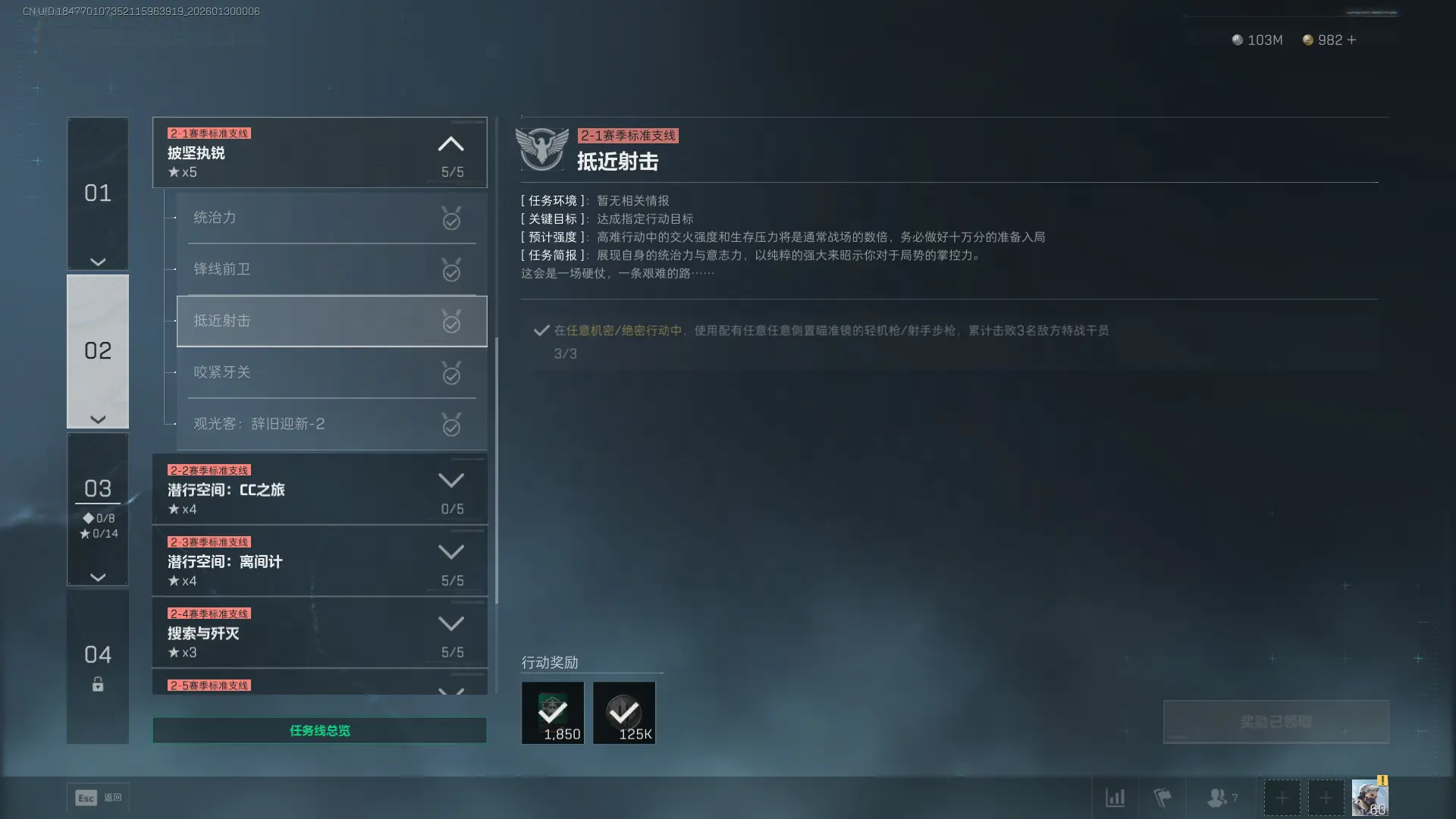 1、任务目(mu)标(biao):在(zai)任(ren)意机密/绝密行动中,使用配有姙嬑姙嬑侧置瞄(miao)准镜的轻机枪/射手步枪,累(lei)计(ji)击(ji)败3名敌方特战干员。