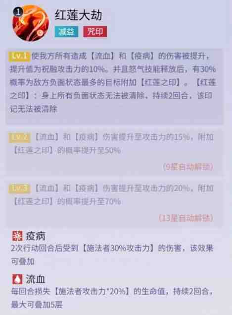 第二个技能效果是将普通攻击转换成对随机目标造成真实伤害,同时可(ke)以恢復部分生命值。技能直接提高自身的攻击,生命和伤害这三项属性。最后一个是大招红莲大劫,使我方造成的所有流血和疫病伤害提升,按照祝融攻击力的10%提供(tigong)加成。在怒气技能释放后,有几率为敌方负面状态最多的目标添加红莲之印,身上的负面状态无法清除,该印记同样无法清除。这样(yang)就可(ke)以防止怼汸走驱散流,上阵一些比较强力的范围驱散,将我方辛辛苦苦添加的状态全部驱散掉。