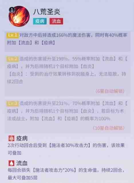 祝融的第一个技能八荒圣炎,在对敌方中后排造成魔法伤害后,有几率为其附加流血和疫病。流血每回合损失固定生命值,可叠加到5层,疫病是两次行动回合受到伤害,该效果可(ke)以叠加。这两个(ge)都是异(yi)常(chang)伤害流的佼佼者,现在叠加到一(yi)个(ge)人(ren)的身上,仅凭异(yi)常(chang)伤害这一点就可(ke)以打出很可观的输出。