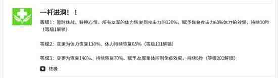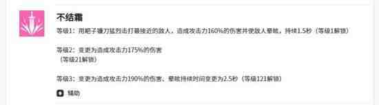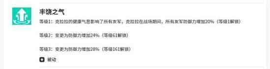 是一个团队防御向的被动技能。在战斗中有概率触发,触发后能提升我方全体队友20%的防御力,在面对高爆发敌人时能为团队争取更多生存空间。该效果在最高品质下,防御力加成可提升至28%。需要注意的是,这个增益效果通常在敌方行(xing)动(dong)的回合才有机会触发。