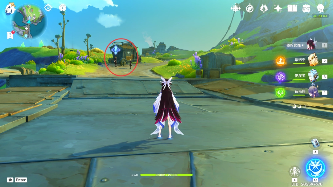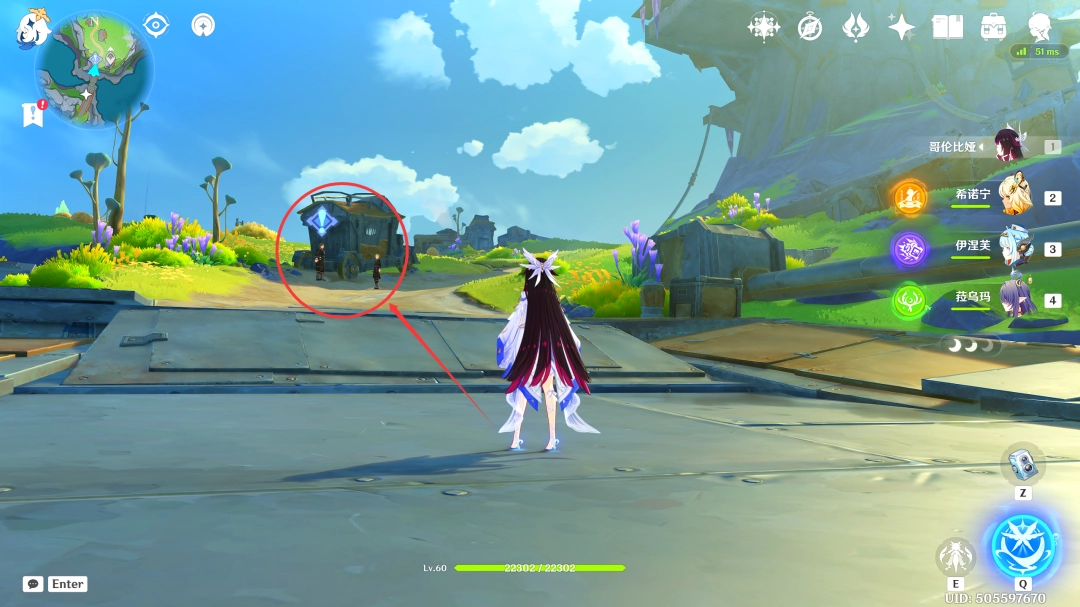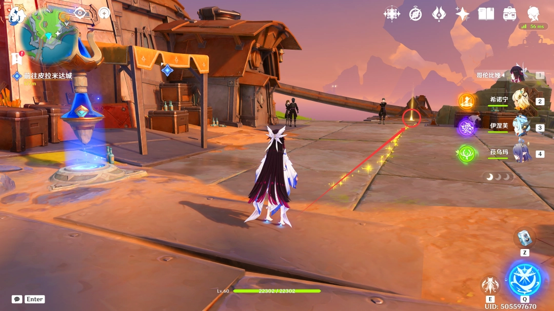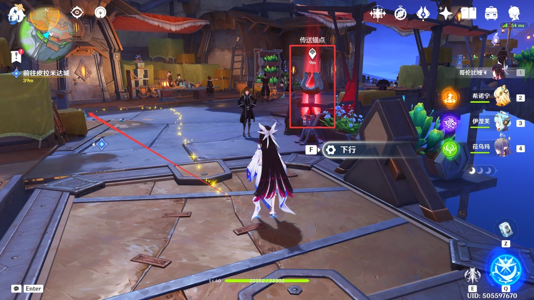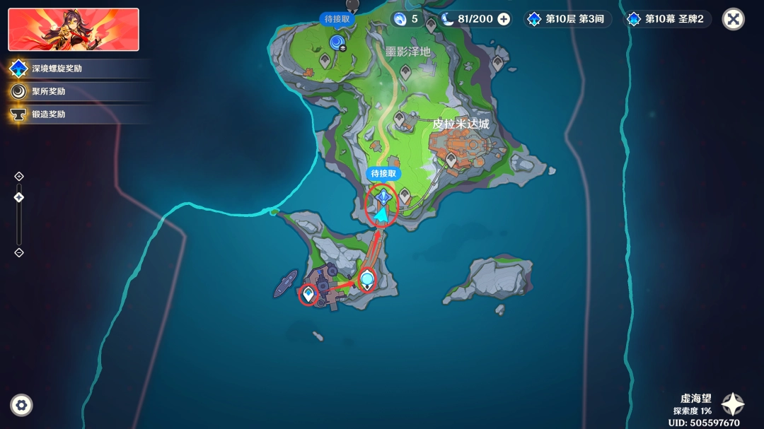 这里我们传送到「虚海望」正南方港口的锚点,来到下图位置(Location)(此传送锚点在版本(Version)更(geng)新(xin)后自动(dong)解锁,这里我们按照下图葒脃路线前进即可,中途的新月神像记得顺手激活一下(yixia))
