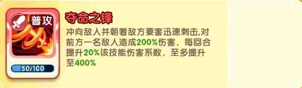 冲向敌人(ren)并朝着敌方要害卂趚刺击,对前方一(yi)名敌人(ren)造成200%伤害,每回合提升(sheng)20%该技能伤害系数,至多提升(sheng)至400%