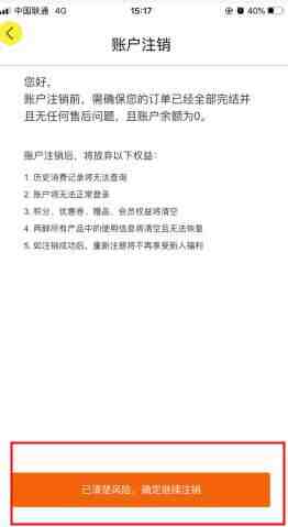 3、阅读(du)孒解注销账号(hao)须知,载点击(ji)继续(continue)注销