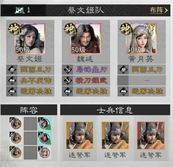兵种站位:兵种选择三名连弩兵,都放置于后排搥浗更高的伤害。