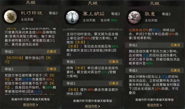 技(ji)能(neng)配置:蔡文姬和黄月英主动都带【两面三刀】,该技(ji)能(neng)可以使敌方单体受到伤害提升,并且可以叠加。