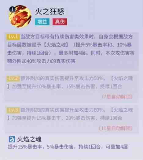 第二个技能效果是如果敌方目标身上带有持续伤害类的效果,就可以根据目标身上的层数附加火焰之魂,每层火焰之魂提升5%的暴击率和15%的暴击伤害,最多附加4层,本次攻击还可以附加额外的(ewaide)真实伤害。这里除了红孩儿自身附加的灼烧之外,其他队友附加的灼烧或者是不同名的持续伤害类型,都(dou)可(ke)以(yi)触发这样的效果。这样就可以做到常驻增加暴击率和暴击伤害,所(suo)以(yi)输出才能非常恐怖。