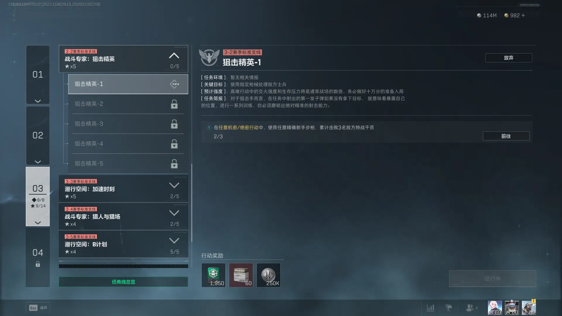 1、任务目标:在任意机密/绝密行动中,使用任意精确射手步枪,累计击败(beat)3名敌方特战干员。