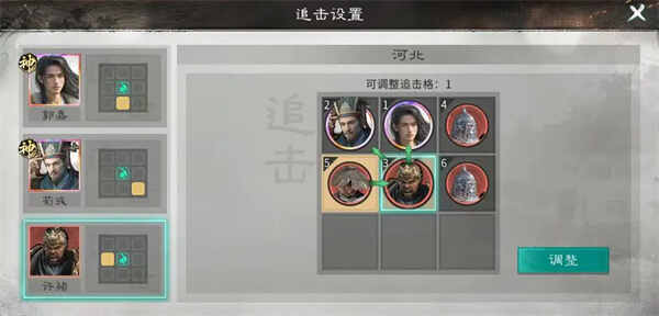 英雄站位:郭嘉、荀彧不站追击格,许褚站郭嘉与荀彧的追击格。