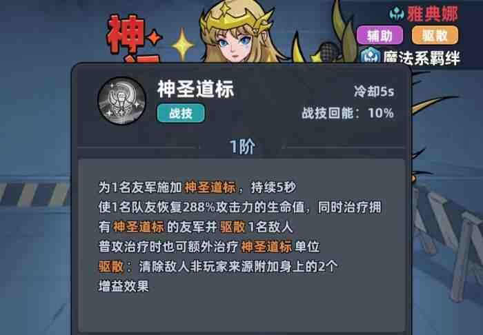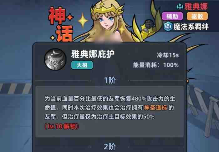 雅典娜可通过自(zi)身(shen)职业特性获得10%的减伤效果,并且自(zi)身(shen)具有格挡率提高10%的幸存者特性,所以即便为辅助,雅典娜自(zi)身(shen)的生存能力(nengli)也并不(bingbu)低。当她释放战技时,会随机挑选一名友军对其施加持(chi)续(xu)5秒的神圣道标,并且会(hui)在(zai)自己为另一名队友治疗时,让拥有(have)神圣道标效果的友军同(tong)样(yang)能享受到本次的治疗,同时还会随机驱散一名敌人身上的两种增益。随着雅典娜的星级提升,她战技的治疗倍率也会大幅提高。